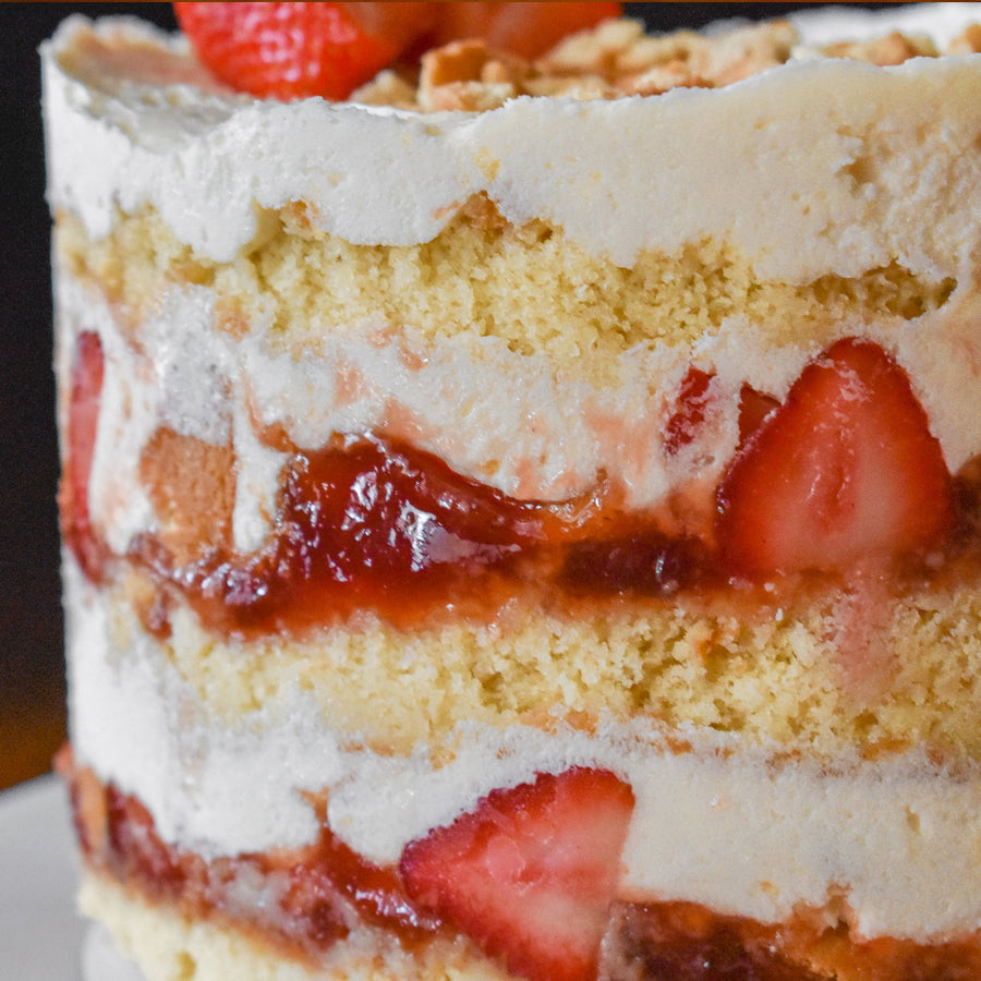 A spin on our classic vanilla. Nothing makes you feel more refreshed than a layer of bright strawberry jam in the center of our classic vanilla cake. With a vanilla cookie crunch and fresh strawberry center, this cake is what you need for a bright day.